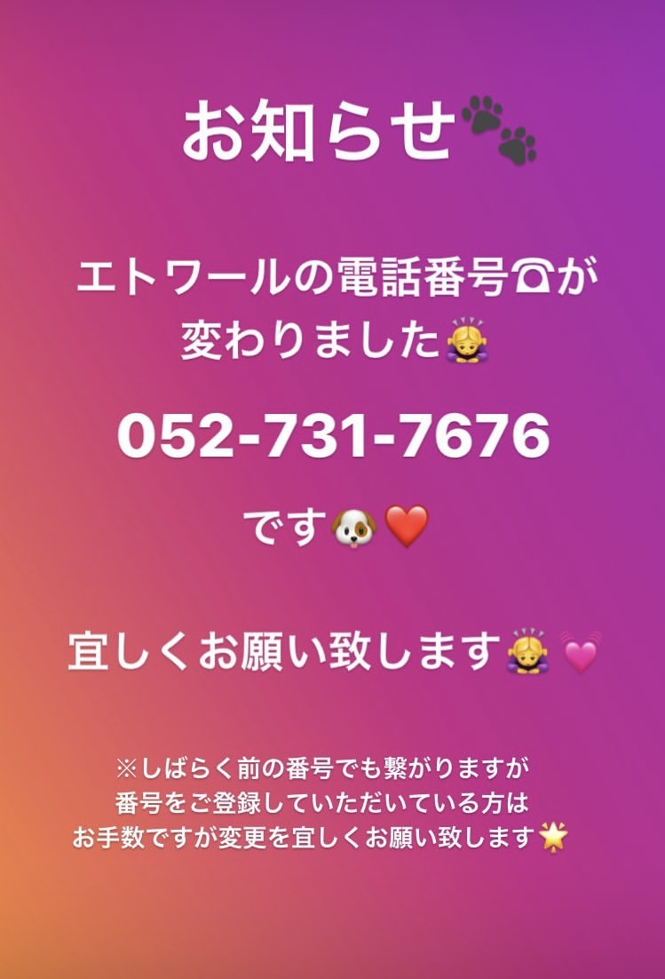 この度、電話番号が052-731-7676に変更になりましたのでご登録してくださっている飼い主様方はお手数ですが変更を宜しくお願い致しますm(__)m